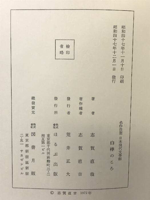 タイトル:白樺のころ-名作自選 日本現代文学館- 発行:ほるぷ出版 著:志賀直哉 昭和47年