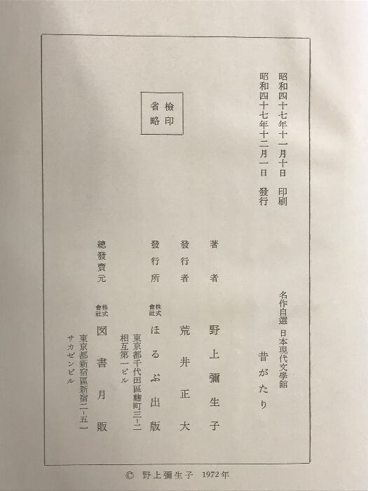 タイトル:昔がたり-名作自選 日本現代文学館- 発行:ほるぷ出版 著:野上彌生子 昭和47年