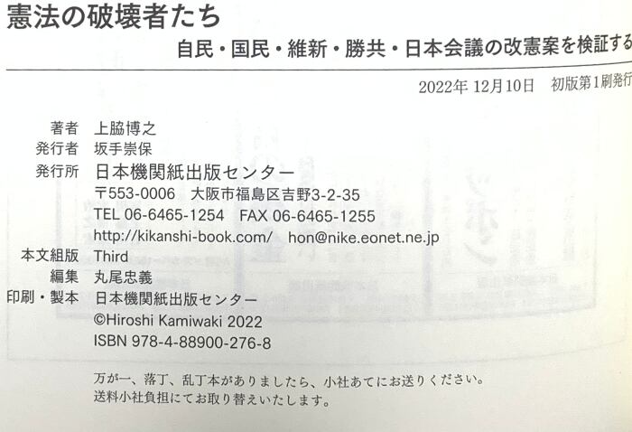 タイトル:憲法の破壊者たち 自民・国民・維新・勝共・日本会議の改憲案を検証する 日本機関紙出版センター 上脇博之