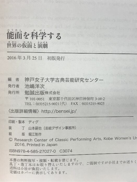 タイトル:能面を科学する 世界の仮面と演劇 勉誠出版 神戸女子大学古典芸能研究センター