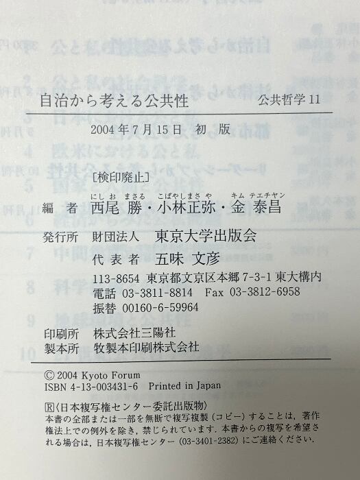 公共哲学 (11) 自治から考える公共性 東京大学出版会 西尾 勝