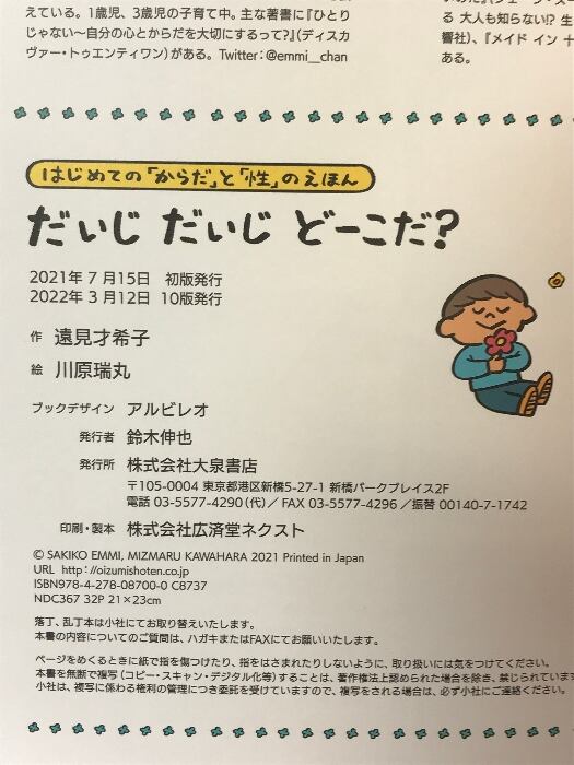 性教育のはじめの一歩は、自分の「からだ」を知ること 幼いころから自分の「からだ」を知ること、また「プライベートパーツ(口や胸、性器)」を理解し、自分も他人も大切な存在だということを認識することが大切です。また、子どもへの性暴力の加害や被害を防ぐためにも「プライベートパーツ」を理解することが重要です。 本書は、著者の遠見才希子医師が自身のお子さん(当時2歳)とのエピソードを交え、からだの大切さだけではなく、一人ひとりが大切な存在ということを伝える”はじめての「からだ」と「性」のえほん”です。