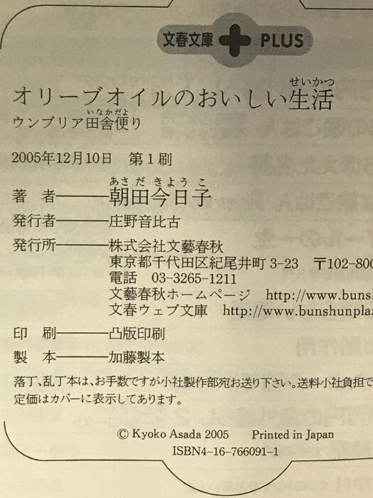 ウンブリア田舎便り オリーブオイルのおいしい生活 (文春文庫PLUS 20-24) 文藝春秋 朝田 今日子