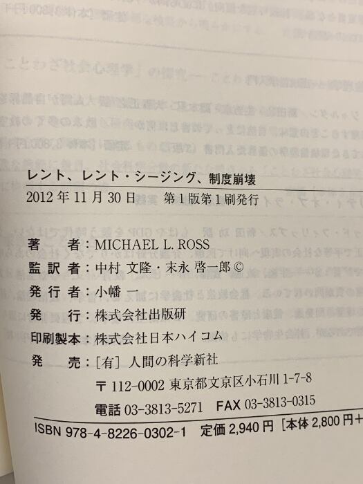 タイトル:レント、レント・シージング、制度崩壊 人間の科学新社 M.L. ロス