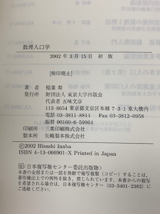 タイトル:数理人口学 東京大学出版会 稲葉 寿