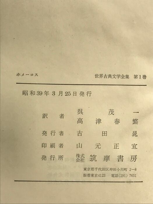 タイトル:世界古典文学全集〈第1巻〉ホメーロス 筑摩書房 訳:高津春繁