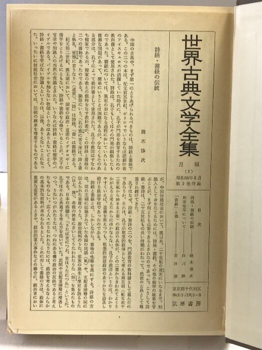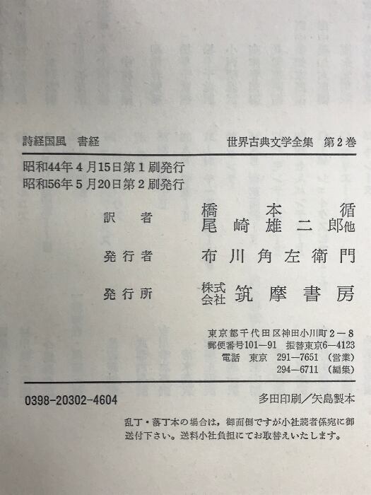 タイトル:世界古典文学全集〈2〉詩経国風・書経 筑摩書房 訳:橋本循・尾崎雄二郎 他