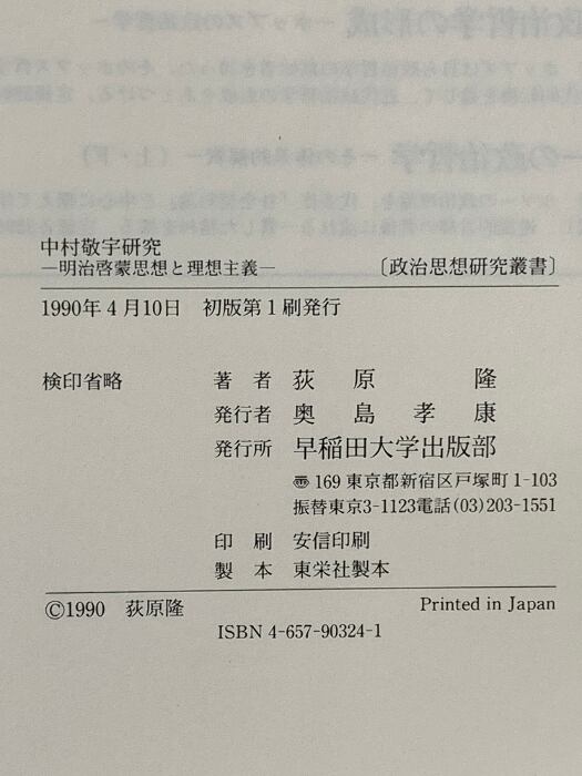 タイトル:中村敬宇研究 明治啓蒙思想と理想主義 (政治思想研究叢書) 早稲田大学出版部 荻原 隆