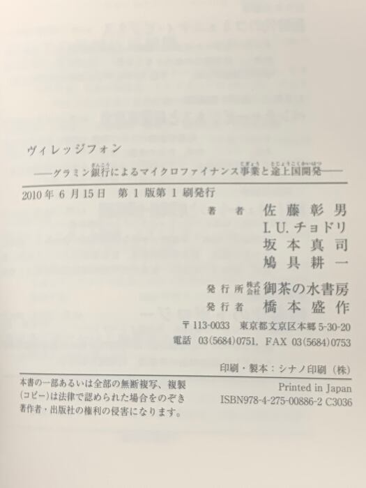 タイトル:ヴィレッジフォン: グラミン銀行によるマイクロファイナンス事業と途上国開発 御茶の水書房 佐藤 彰男