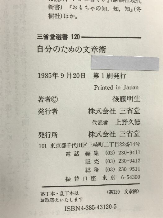 タイトル:自分のための文章術 (三省堂選書 120) 三省堂 後藤 明生