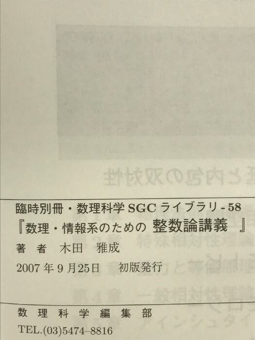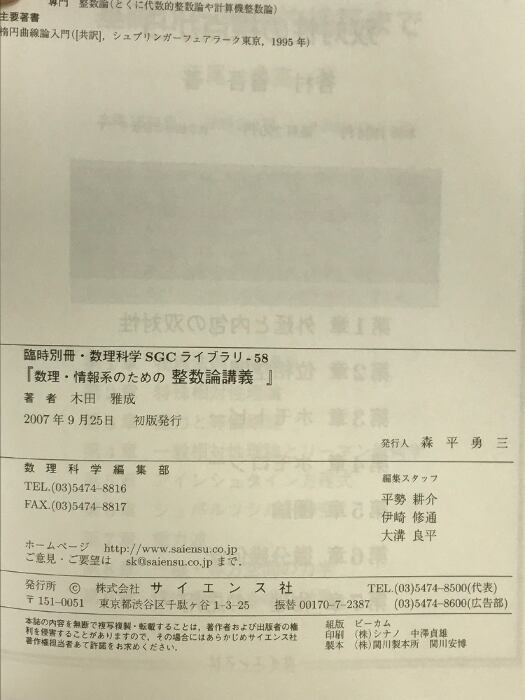 タイトル:臨時別冊・数理科学 「数理・情報系のための整数論講義」 [雑誌] サイエンス社 木田雅成(電気通信大学教授)