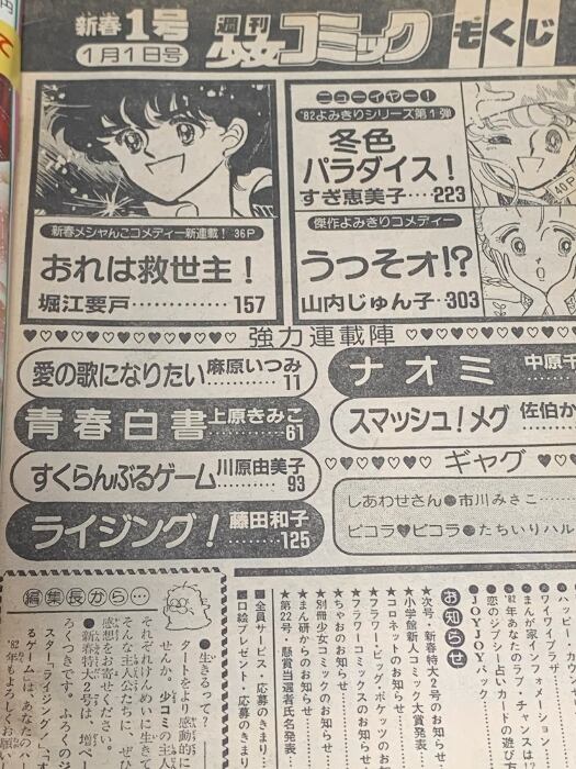 9 週刊 少女コミック 1982年1月1日 NO.1 愛の歌になりたい 上原きみこ 川原由美子 堀江要戸