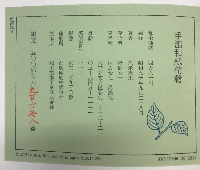 タイトル:手漉和紙精髓(限定1500部の内968番)発行:講談社 著:久米康生 昭和50年