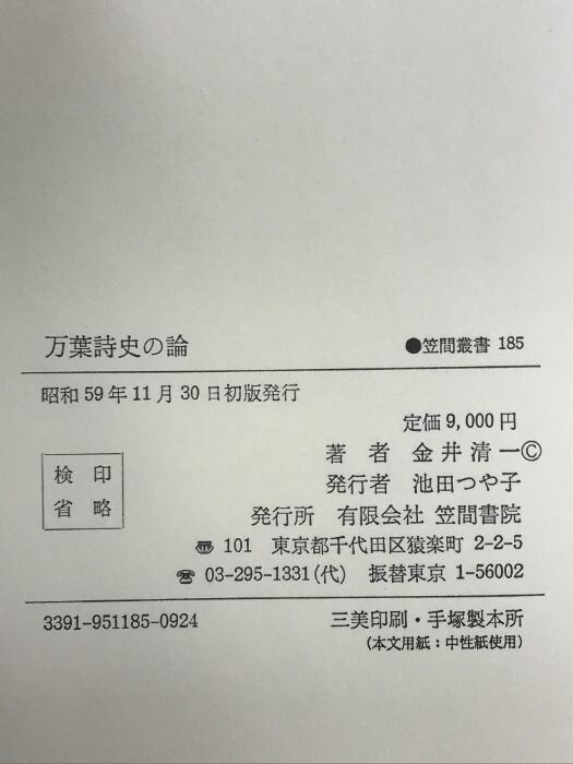 万葉詩史の論 (笠間叢書〈185〉) 笠間書院 金井 清一
