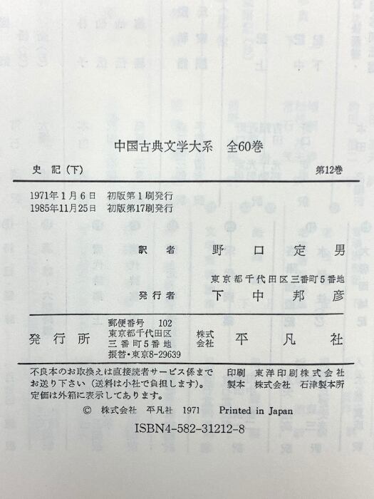 タイトル:史記 下 中国古典文学大系 12 平凡社 司馬 遷