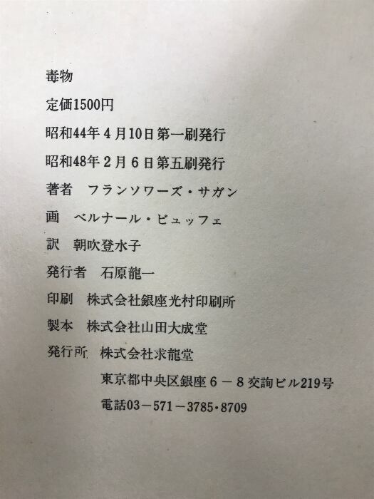 タイトル:TOXIQUE 毒物 刊:求龍堂 著:F・サガン 画:B・ビュッフェ 訳:朝吹登水子 昭和48年