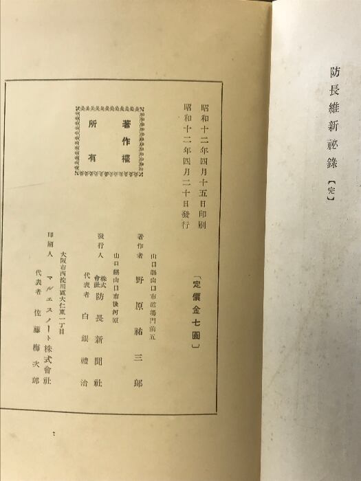 防長維新秘録 発行:防長新聞社 著:野原祐三郎 昭和12年