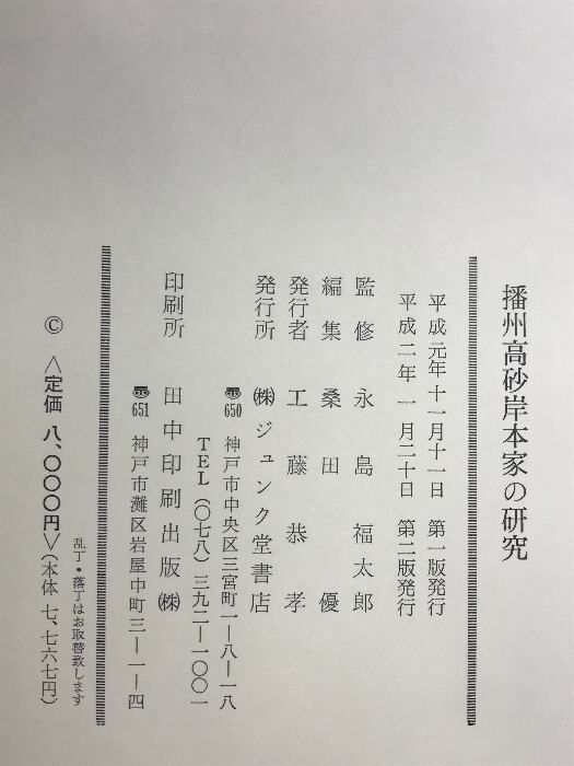 播州高砂岸本家の研究 ジュンク堂書店 監修:永島福太郎 編集:桑田優 平成2年