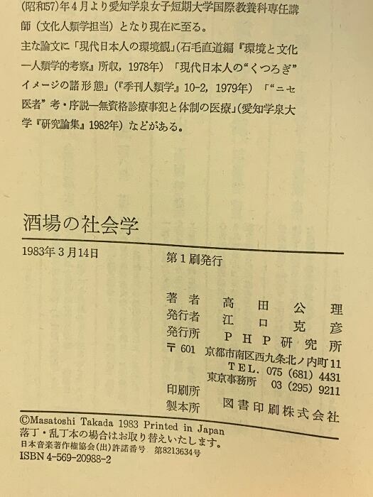 タイトル:酒場の社会学 PHP研究所 高田 公理