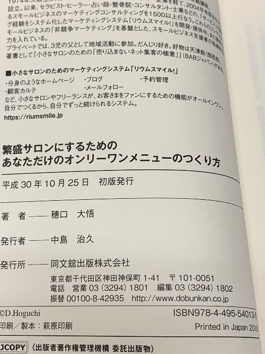 タイトル:繁盛サロンにするための あなただけのオンリーワンメニューのつくり方 (DOBOOKS) 同文舘出版 穗口 大悟