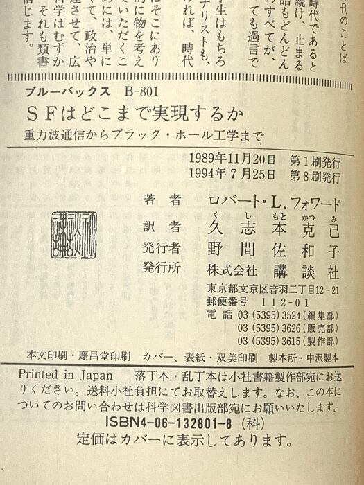 タイトル:SFはどこまで実現するか 重力波通信からブラック・ホール工学まで (ブルーバックス 801) 講談社 ロバート・L・フォワード