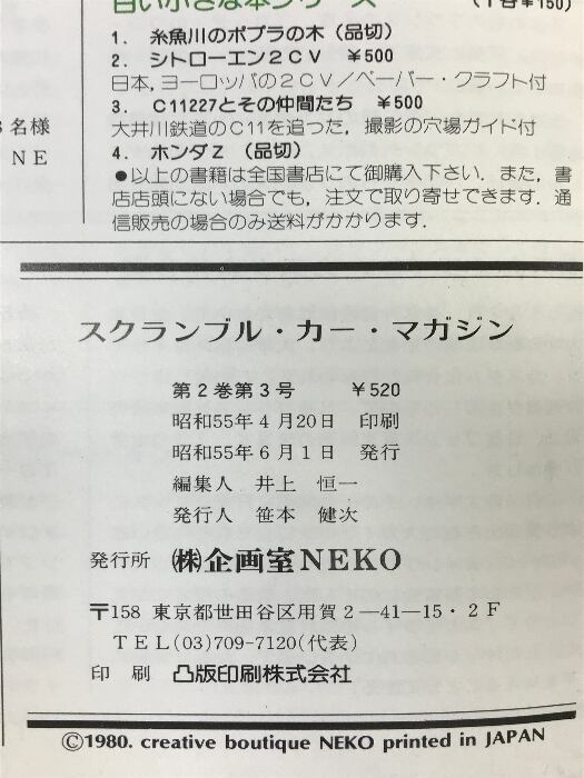 タイトル:「スクランブル・カー・マガジン」 1980年6月号 創刊第3号(第2巻-第3号) 発行:企画室ネコ 特集:フランス車 ALPINE RENAAULT A110/A310