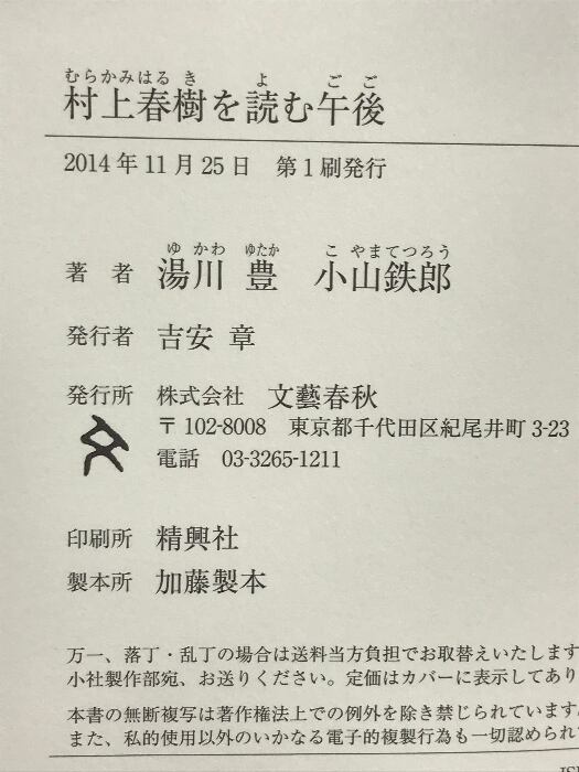 タイトル:村上春樹を読む午後 文藝春秋 小山 鉄郎