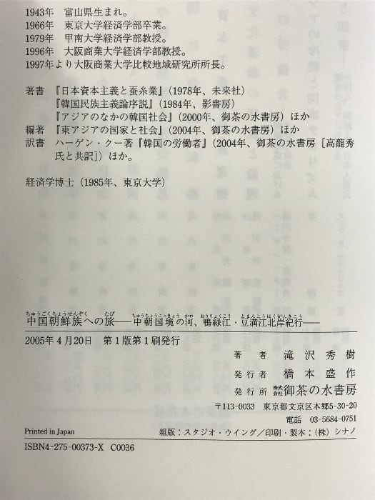 中国朝鮮族への旅: 中朝国境の河、鴨緑江・豆満江北岸紀行 御茶の水書房 滝沢 秀樹