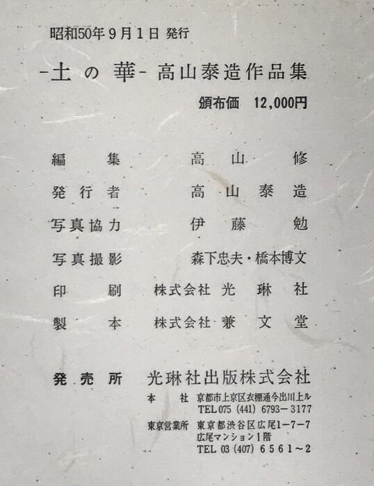 タイトル:【図録】土の華 高山泰造作品集 発売:光琳社 編集:高山修 昭和50年