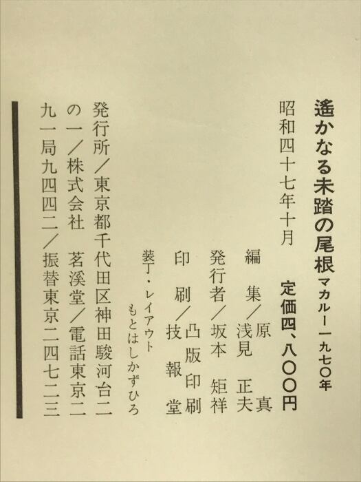 タイトル:遥かなる未踏の尾根 MAKALU1970 日本山岳会東海支部マカルー学術遠征隊 発行:茗渓堂 編集:原 真・浅見正夫 昭和47年