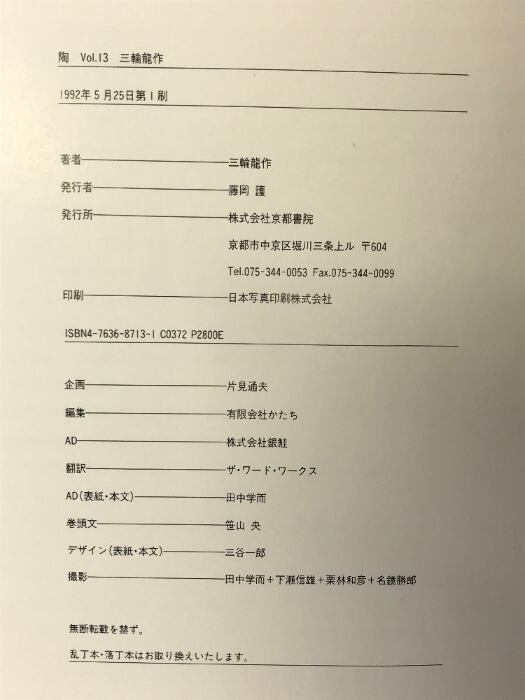 【図録】「陶」 Vol.13 三浦龍作 京都書院 1992年