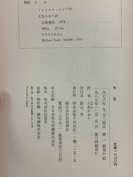 タイトル:モモ 時間どろぼうとぬすまれた時間を人間にかえしてくれた女の子のふしぎな物語 岩波書店 ミヒャエル エンデ