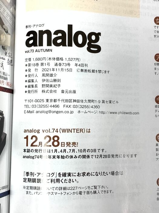 analog 2021 AUTUMN vol.73 令和3年11月15日発行 季刊・アナログ 真空管アンプの魅力 私の好きなジャズピアノ・レコード 音元出版
