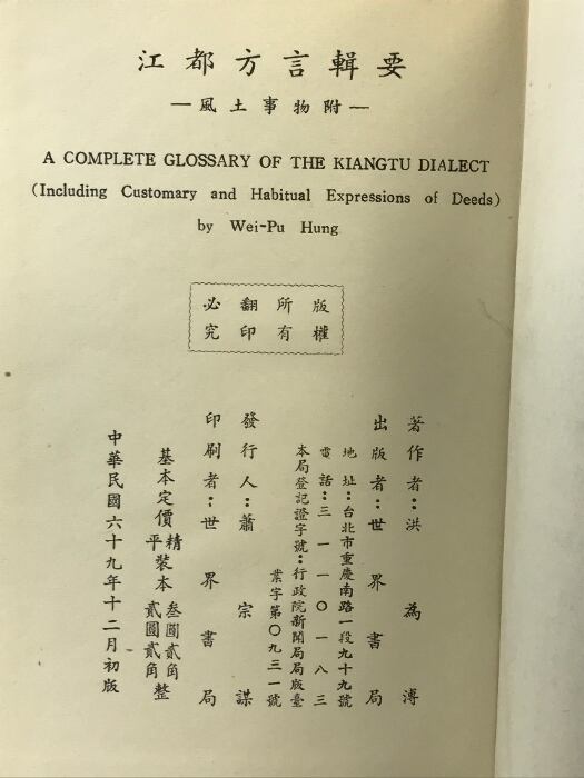 タイトル:【中国書】江都方言輯要 -風土事物附- 出版:世界書局 著:洪為溥 中華民国69年12月初版