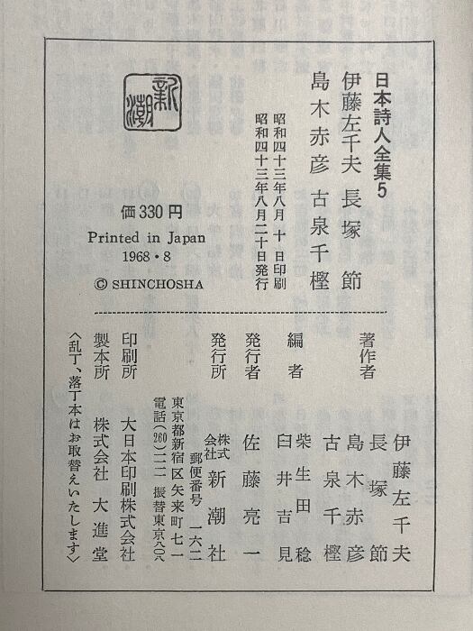 タイトル:伊藤左千夫・長塚節・島木赤彦・古泉千樫 日本詩人全集 5 新潮社 伊藤左千夫