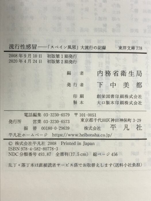 流行性感冒 「スペイン風邪」大流行の記録 (東洋文庫) 平凡社 内務省衛生局