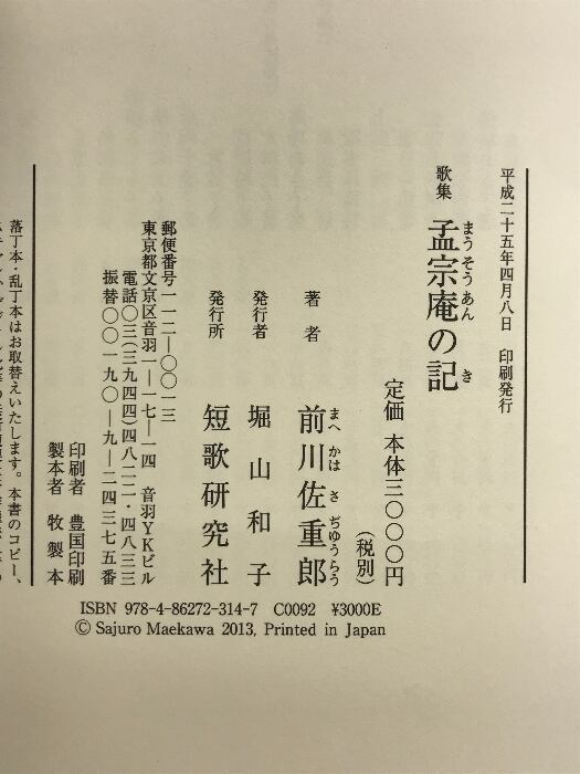 タイトル:孟宗庵の記: 歌集 短歌研究社 前川佐重郎