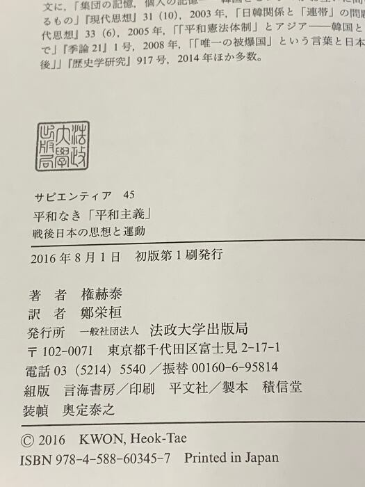 タイトル:平和なき「平和主義」: 戦後日本の思想と運動 (サピエンティア) 法政大学出版局 権 赫泰
