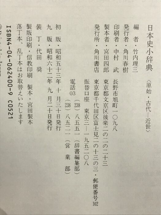 タイトル:日本史小辞典 原始・古代-近世 (角川小辞典 24) KADOKAWA 竹内 理三