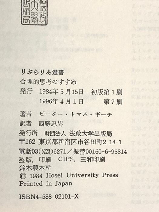 合理的思考のすすめ (りぶらりあ選書) 法政大学出版局 ピーター・トマス・ギーチ