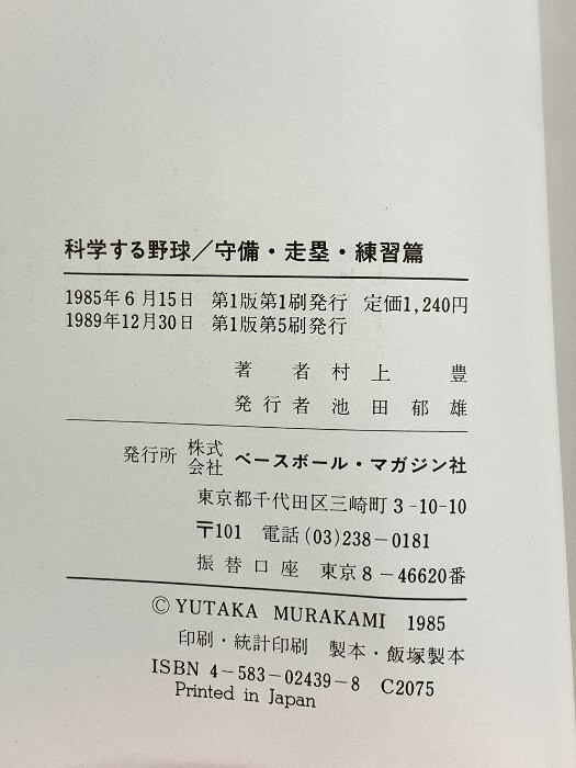 科学する野球 (守備,走塁,練習篇) ベースボール・マガジン社 村上 豊