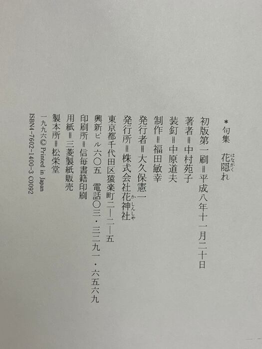 中村苑子句集 花隠れ 花神社