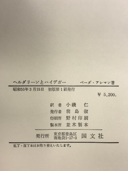 ヘルダリーンとハイデガー 国文社 著:ベーダ・アレマン 訳:小磯仁 昭和55年