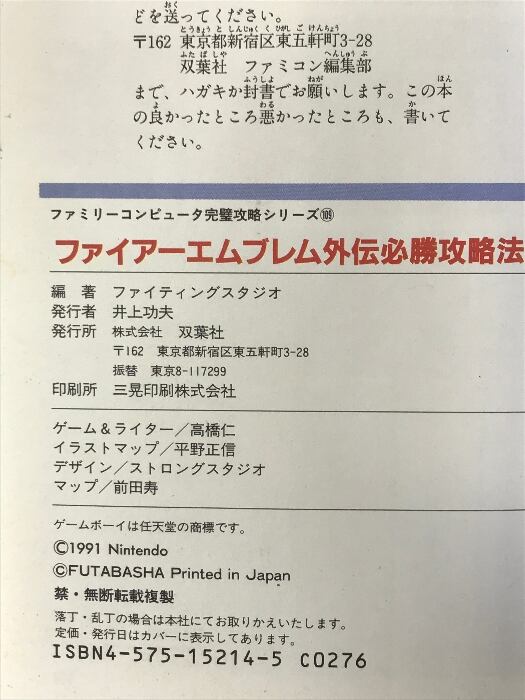【初版】ファイアーエムブレム外伝必勝攻略法 (ファミリーコンピュータ完璧攻略シリーズ 109) 双葉社 ファイティングスタジオ