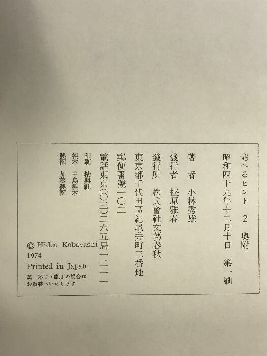 タイトル:考へるヒント(2冊セット)文芸春秋 著:小林秀雄 昭和39年 昭和49年