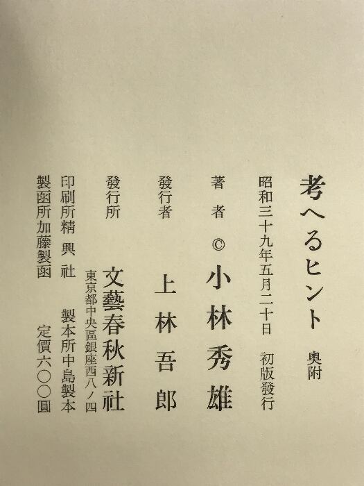 考へるヒント(2冊セット)文芸春秋 著:小林秀雄 昭和39年 昭和49年