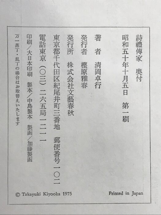 タイトル:詩禮傳家(詩礼伝家)文藝春秋 著:清岡卓行 昭和50年