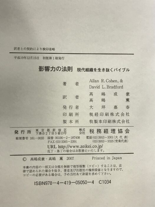 タイトル:影響力の法則 税務経理協会 アラン.R.コーエン デビット.L.ブラッドフォード 訳:高嶋成豪・高嶋薫 平成19年