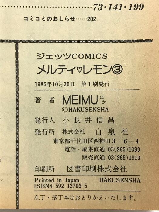 タイトル:【初版】メルティ・レモン 3 (ジェッツコミックス) 白泉社 Meimu
