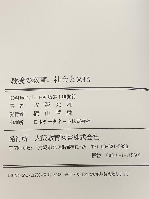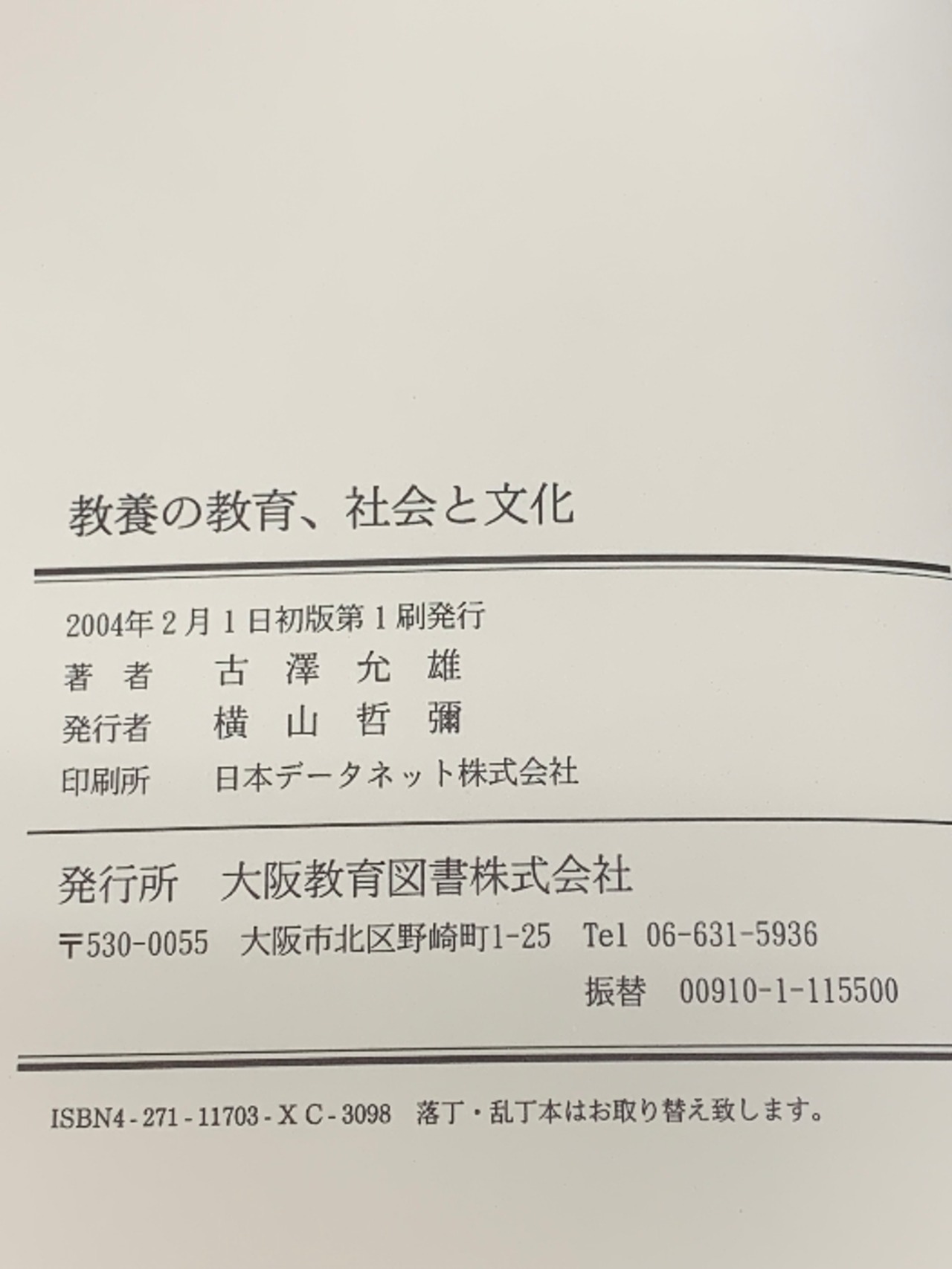 タイトル:教養の教育、社会と文化 大阪教育図書 古沢満雄